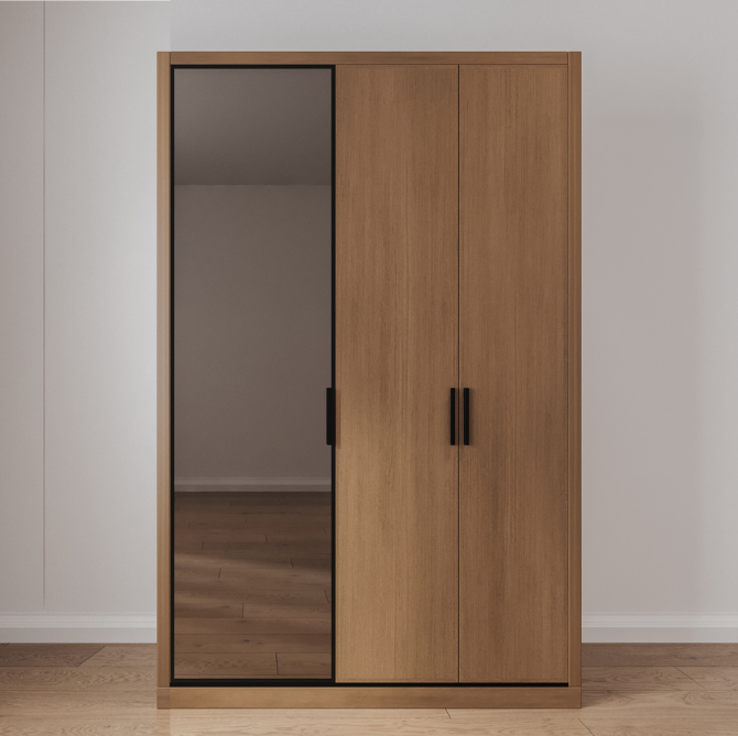 High-quality MDF boards with a melamine veneer and tinted mirror glass framed with premium black aluminum pieces make up the wardrobe's main body and cabinets.